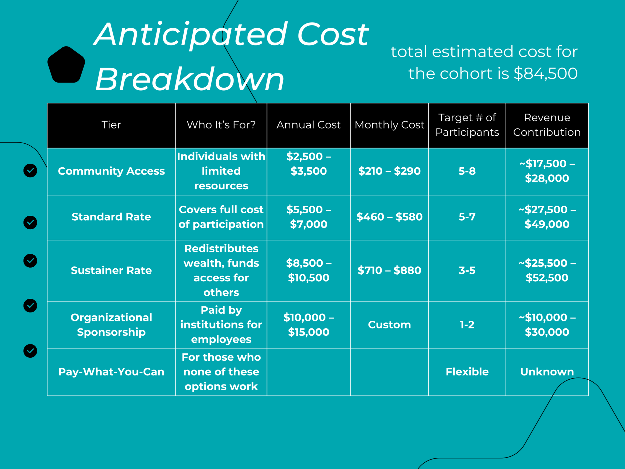 Rather than a fixed fee, we offer four pricing tiers based on financial access and organizational support. This model ensures that those with financial resources help sustain access for those with less while keeping the cohort financially viable.